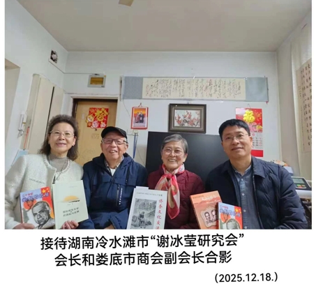2025年12月18日,武汉市娄底商会常务副会长李新民董事长,冷水江市谢冰莹研究会翟梅华会长,拜访国际报告文学研究开拓者与奠基人、《中国女兵记者第一人﹣﹣谢冰莹》首位权威界定专家、华中师范大学原新闻系(文学院)教授尹均生先生和夫人蔡根娣老师,受到盛情接待。