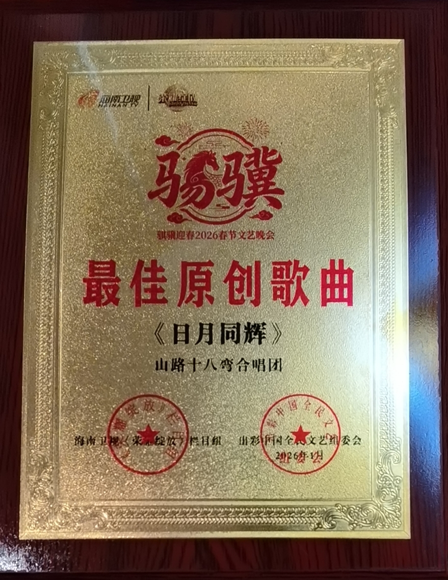 近日,在全民春晚中,由华侨诗人张春台原创诗《日月同辉》,由武汉市音协作曲家段莹作曲,由山路十八弯合唱团演唱,作为全国唯一一支进京录制的团队,进京演出圆满成功。荣获"骐骥迎春2026全民春晚"最佳原创歌曲金奖。